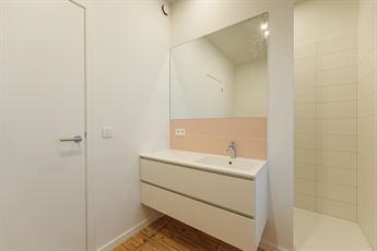 De slaapkamer bevindt zich aan de voorzijde en werd afgewerkt met een warme houten vloer, wat zorgt voor een rustige en uitnodigende sfeer. De badkamer is praktisch én comfortabel ingericht met een ligbad, inloopdouche, lavabomeubel en een tijdloze afwerking. Daarnaast is er een apart toilet en een aparte technische ruimte met aansluitingen voor wasmachine en droogkast. Alles werd recent vernieuwd en is klaar voor onmiddellijk gebruik.