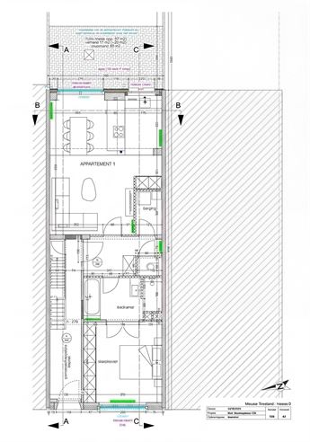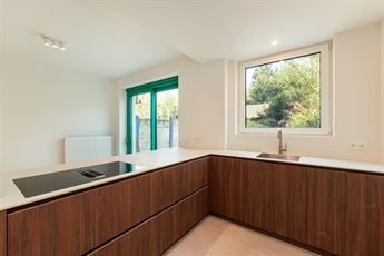 Via de inkomhal bereik je alle ruimtes van het appartement. Achteraan opent zich de leefruimte met open keuken, waar grote raampartijen en het opvallende groene schuifraam zorgen voor een overvloed aan licht én een frisse toets kleur. De schuifdeur trekt meteen de aandacht en versterkt het contact met de tuin, waardoor binnen en buiten mooi in elkaar overvloeien.