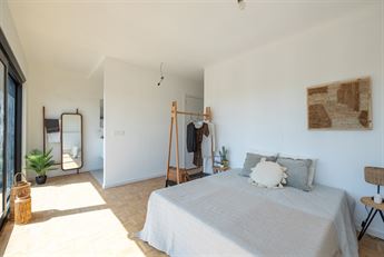 De ruime slaapkamer sluit naadloos aan bij de leefruimte en biedt