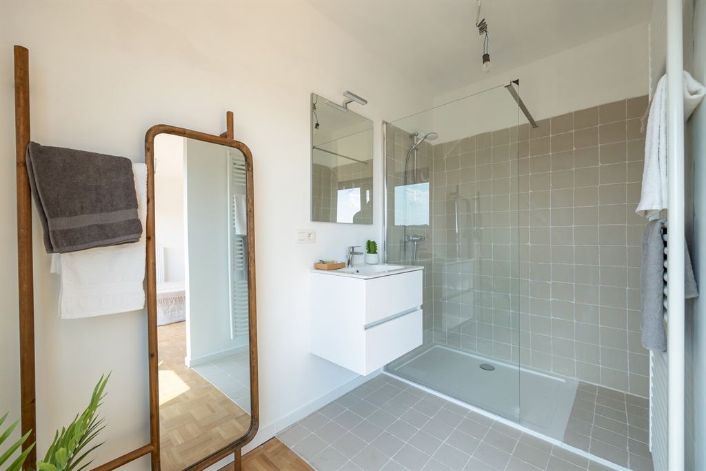 een inloopdouche, lavabo met spiegelkast en handdoekdroger. Een ventilatiesysteem zorgt voor een