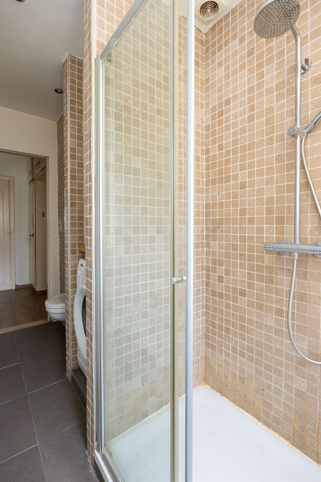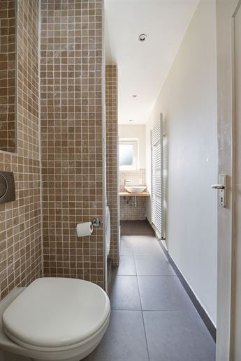 vindt er een douchecabine, een breed lavabomeubel, een modern hangtoilet en een ingebouwde