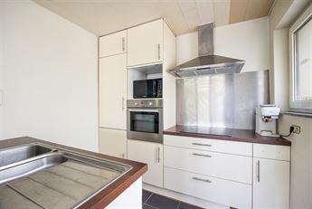 De woonkamer loopt naadloos over in de keuken. Die is compact,
