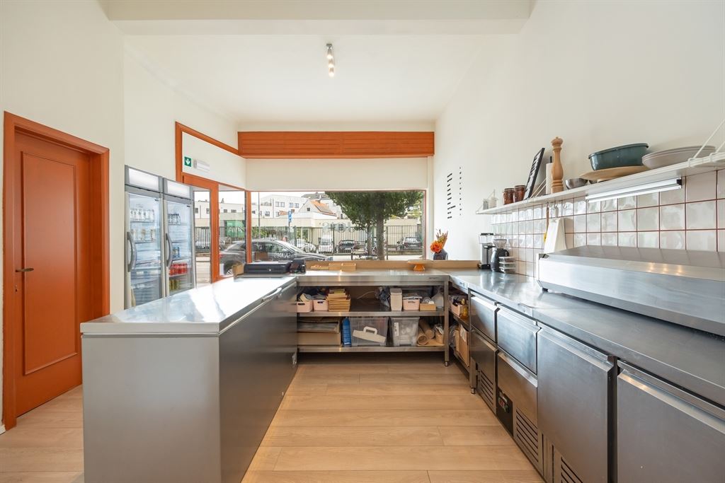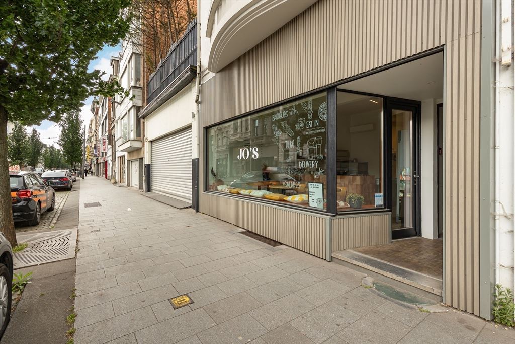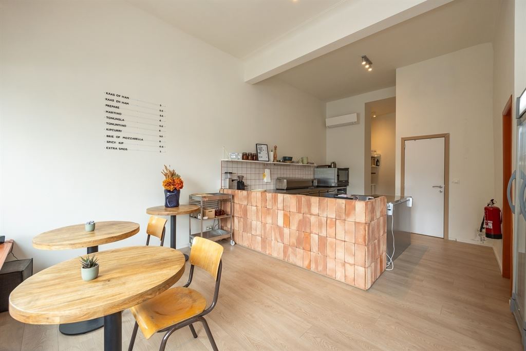 In een kleinschalig, verzorgd gebouw met een charmante gevel, in de Brederodestraat 6, vind je hier op het gelijkvloers deze instapklare zaak, die je zou kunnen omvormen tot kantoor.  Meteen links stap je de handelszaak binnen, waar de elegante, laminaatparket opvalt, net als het licht dat hier mooi binnenstroomt door de brede raampartij. Meteen bij het binnenkomen heb je een ingebouwde zitbank waar het gezellig zitten is. Achter de trendy toog afgewerkt terracottategels bevindt zich de keuken.