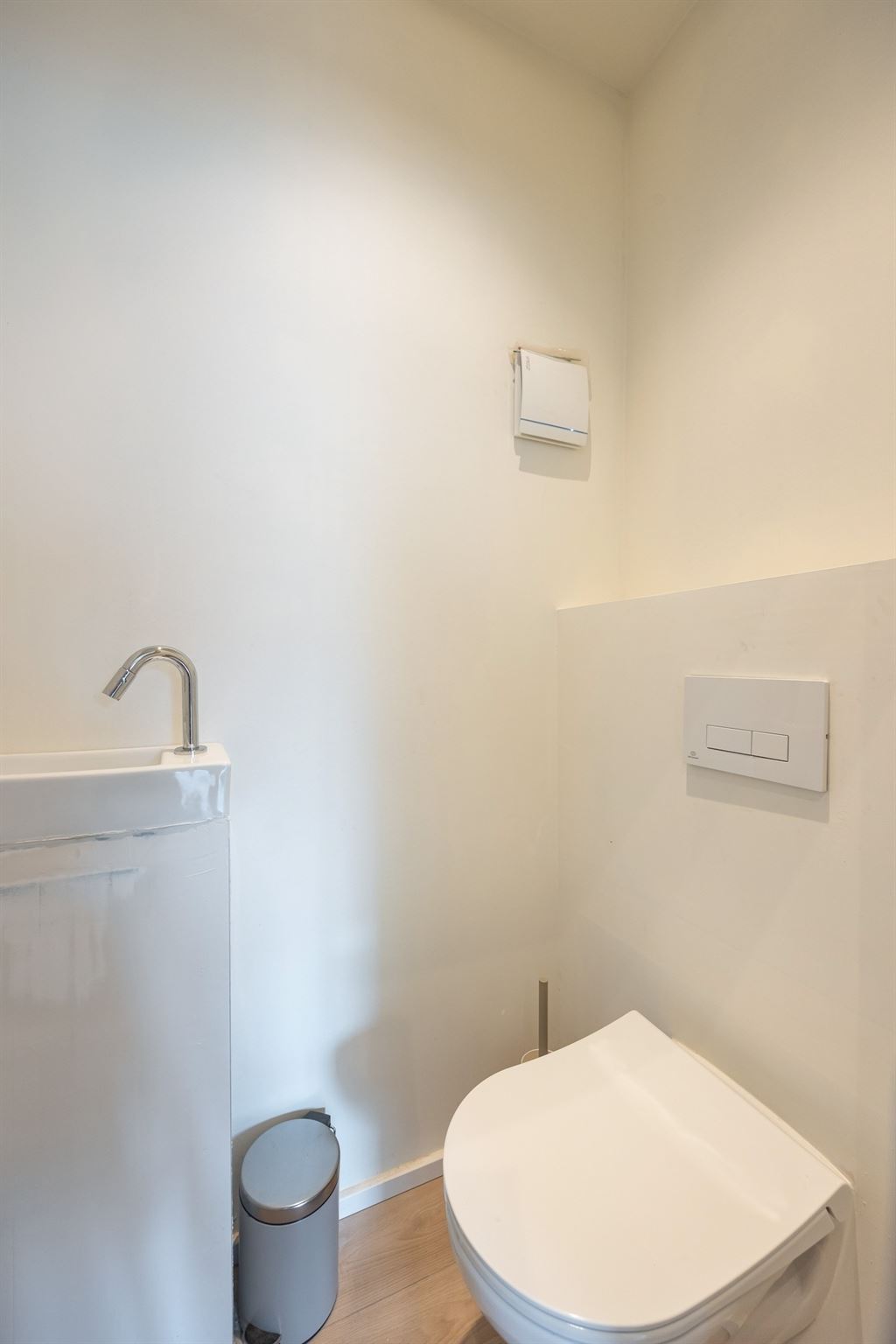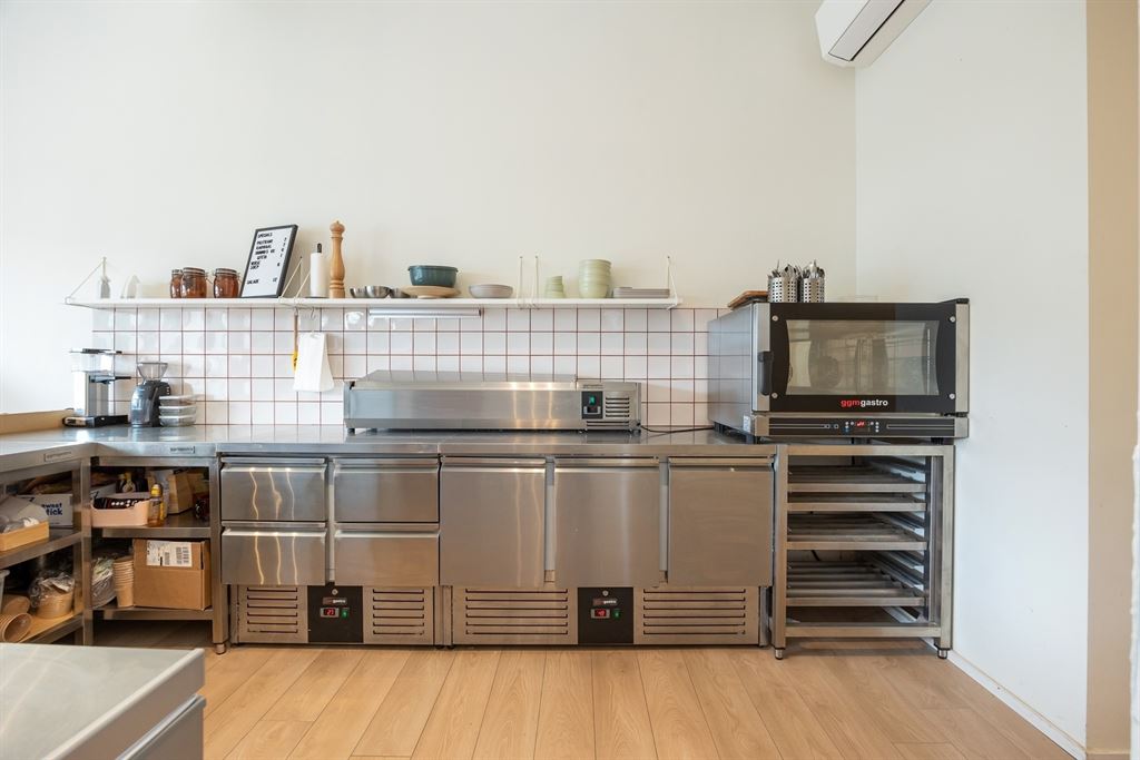Mede dankzij de hoge plafonds heb je hier een zaak met een ruimtelijk gevoel.  Achteraan heb je nog een aparte ruimte met een hangtoilet en een handenwasser.