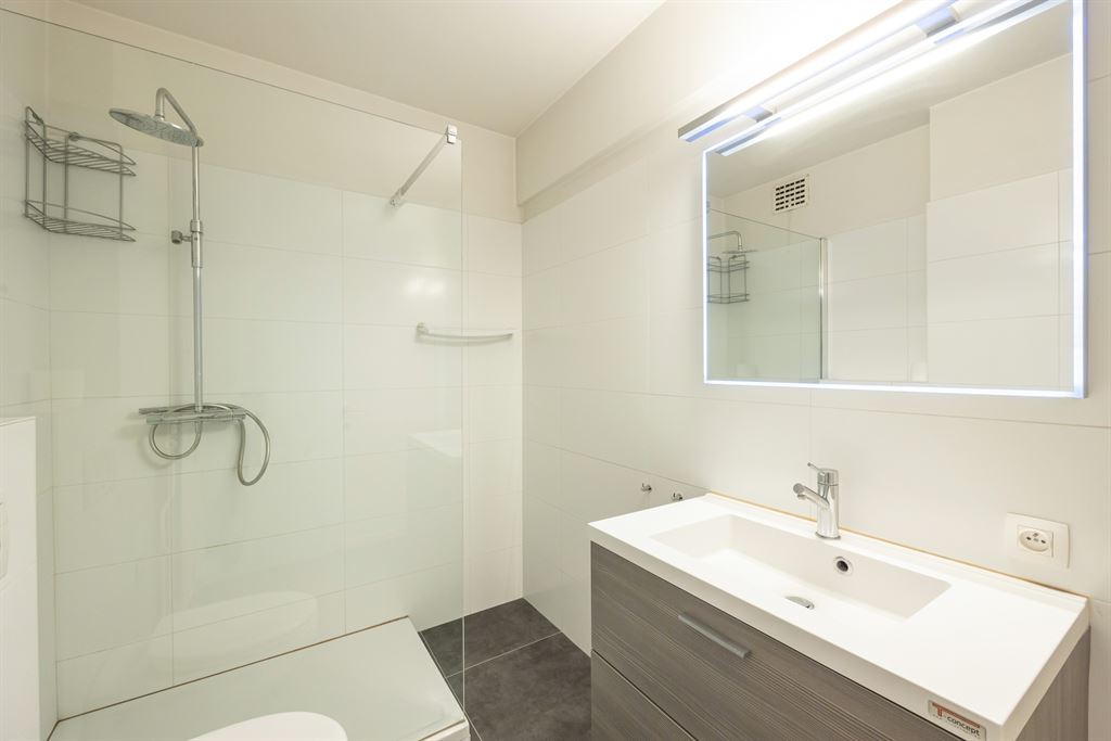 De badkamer is strak en hedendaags: met een ruime inloopdouche,