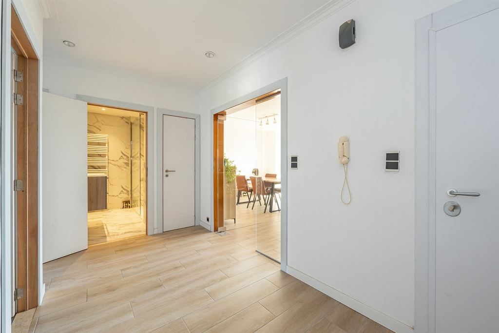 inkomhal met veiligheidsdeur en ingemaakte kast bereik je alle ruimtes.