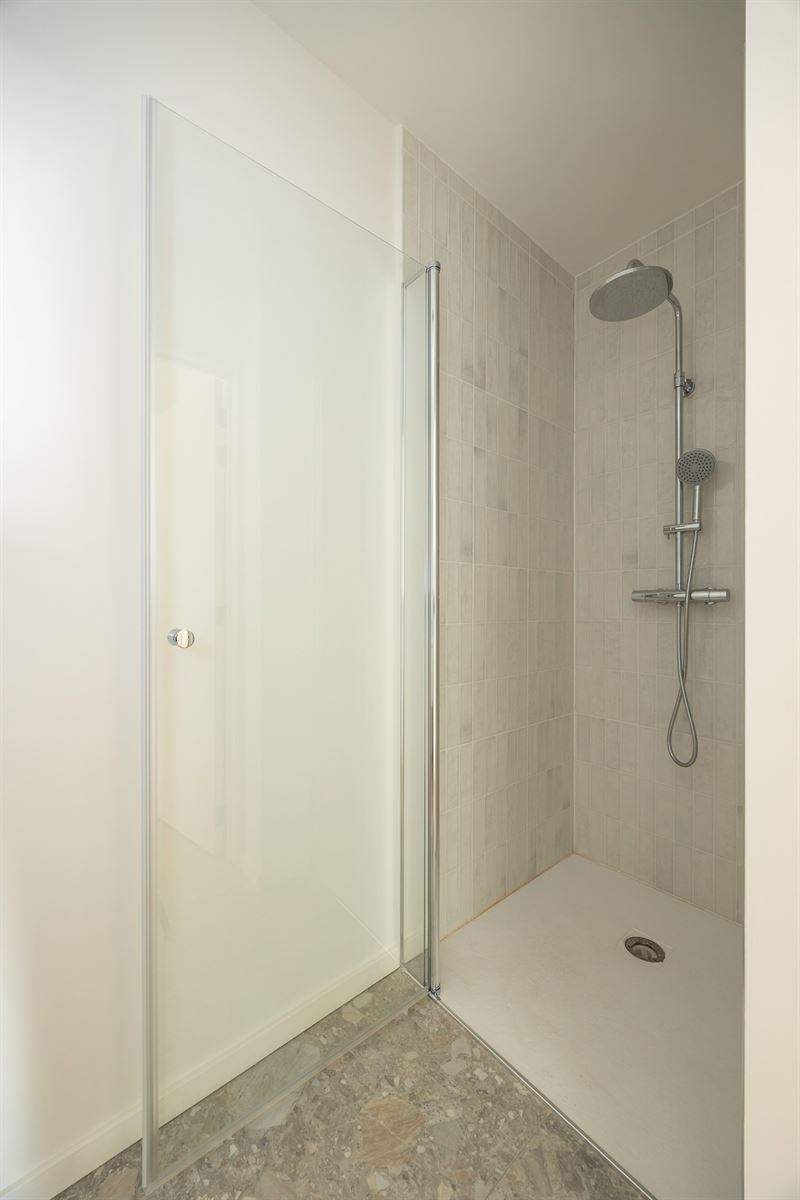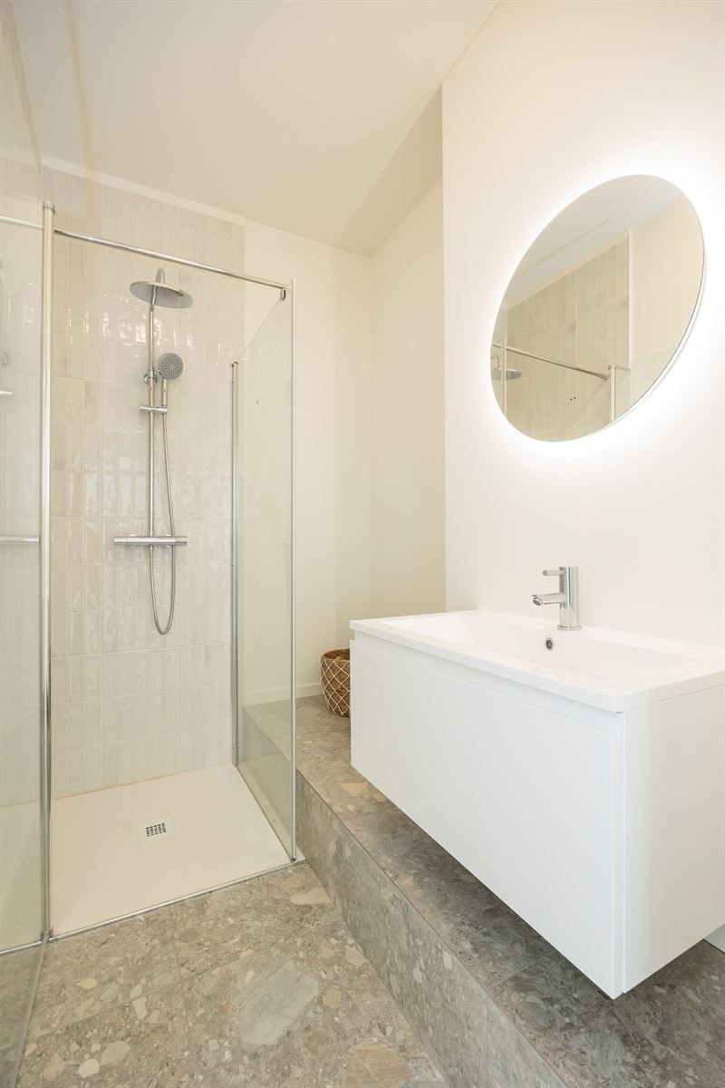 Via de nachthal bereik je de drie slaapkamers, elk met dezelfde parketvloer, aluminium ramen met hoogrendementsglas en ingebouwde ventilatie. De badkamer straalt luxe uit met een inloopdouche voorzien van regenkop, dubbele wastafel, grote spiegel en terrazzo vloer- en wandtegels in steenlook. Daarnaast is er nog een aparte berging en een apart toilet aanwezig.