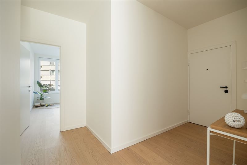 Reeds bij het binnenkomen merk je dat er veel aandacht is besteed aan afwerking en detail. De inkomhal leidt je naar het volledige appartement, waar een doorlopende houten parketvloer voor een warme en stijlvolle uitstraling zorgt. De open keuken is voorzien van kwalitatieve toestellen van Whirlpool, een inductiekookplaat en een elegant werkblad. Ze sluit aan op een lichtrijke woonkamer met grote ramen en moderne accenten, zoals zwarte inbouwspots. Het schuifraam opent naar het terras, waardoor binnen- en buitenleven moeiteloos in elkaar overvloeien.