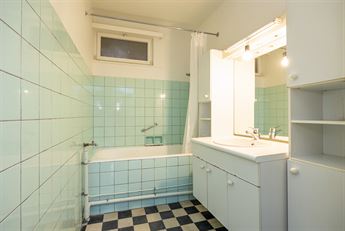 muren en de dambordtegels krijgt de kamer een leuke, nostalgische sfeer. Een raampje zorgt voor