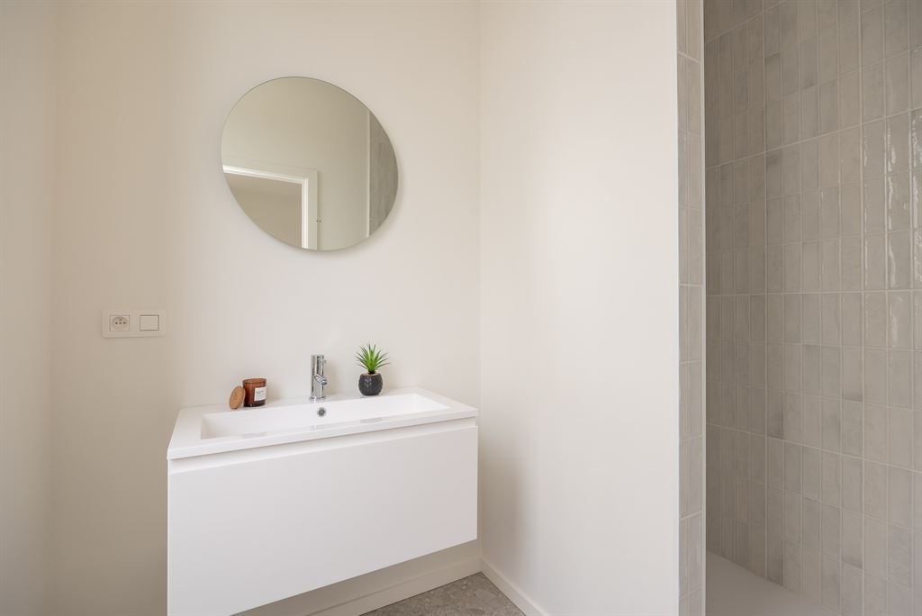 en keramische tegels, dubbele lavabo, een ronde spiegel en terrazzotegels in steenlook.