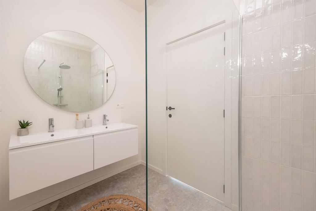 dubbele lavabo, grote spiegel en terrazzotegels in steenlook. Daarnaast heeft het appartement