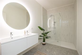 dubbele lavabo, grote spiegel en terrazzotegels in steenlook. Daarnaast heeft het appartement