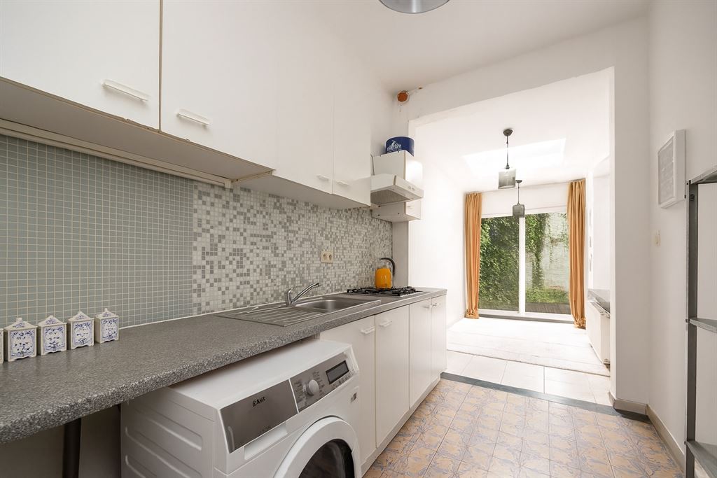dampkap en betegelde wanden. Achter de keuken bevindt zich de vernieuwde badkamer, afgewerkt met