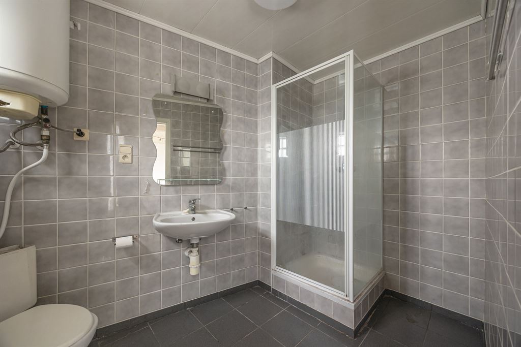 werkplek. De badkamer van 7m² heeft een douche, toilet en lavabo, en is eveneens te renoveren