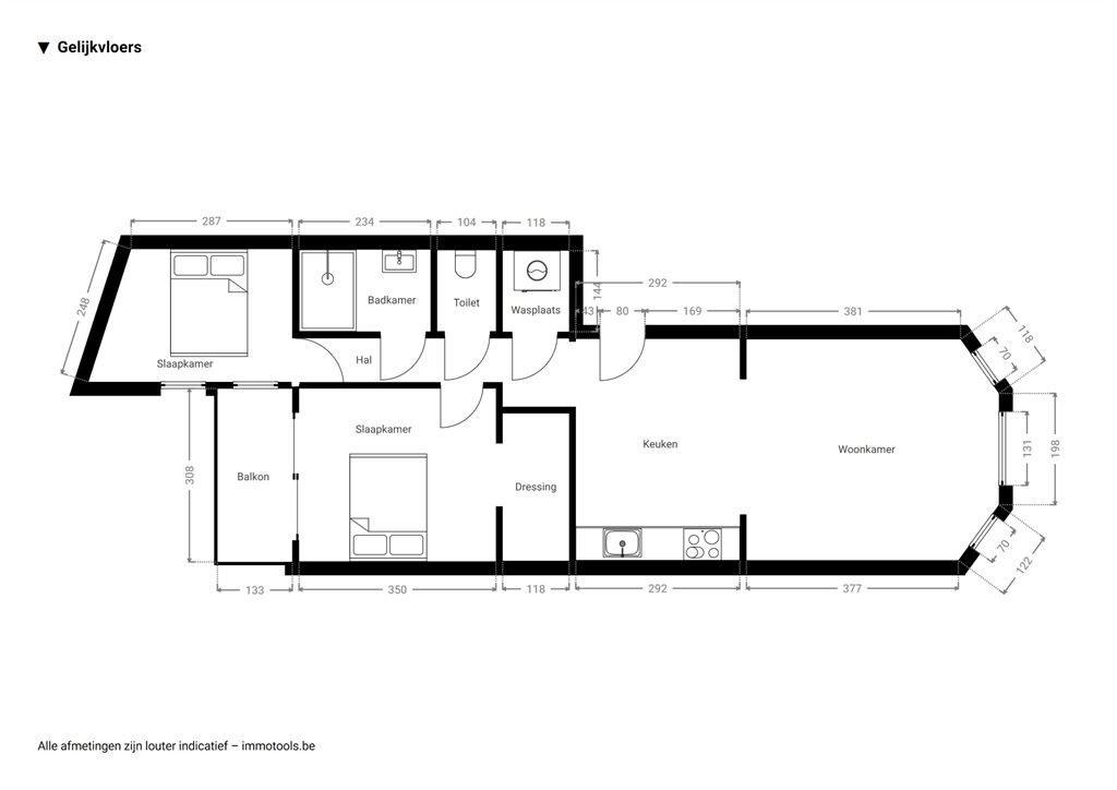 Grote leefruimtes met een open keuken en telkens twee slaapkamers,