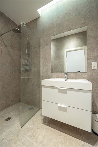 badkamer met inloopdouche, lavabo, handdoekenradiator en twee slaapkamers, waarvan de master