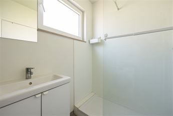 badkamer. Daar vind je een inloopdouche en een lavabomeubel met spiegel. Het raam zorgt