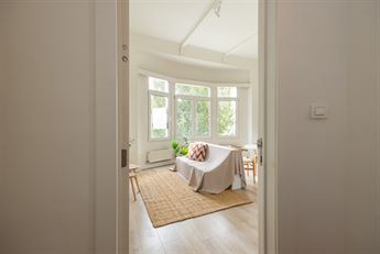 parketvloer. Ze geven de kamer een ruim en lichtrijk gevoel. Aan de overkant van de straat zijn