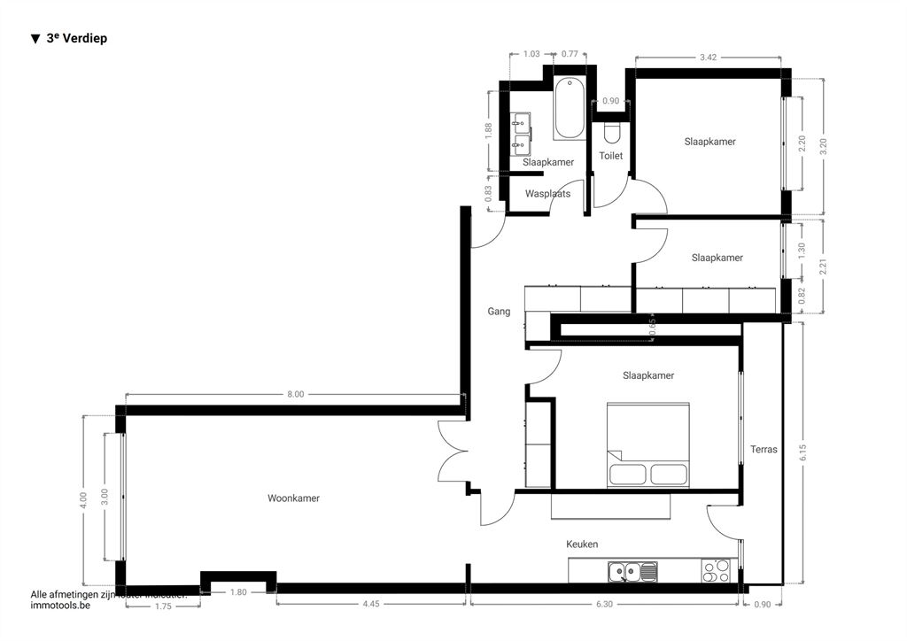 heeft parket en een groot bedmeubel, terwijl de andere twee kamers tapijt hebben. Alles is steeds zeer