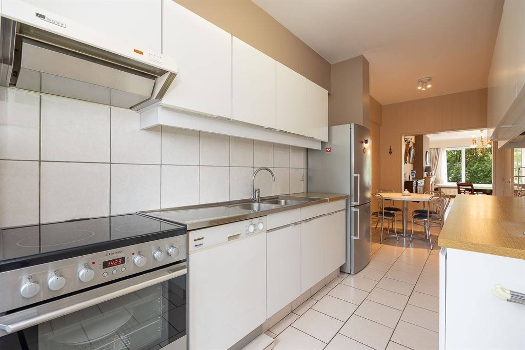 prachtige visgraatparket. Aansluitend ligt de open keuken, uitgerust met inox werkblad, extra