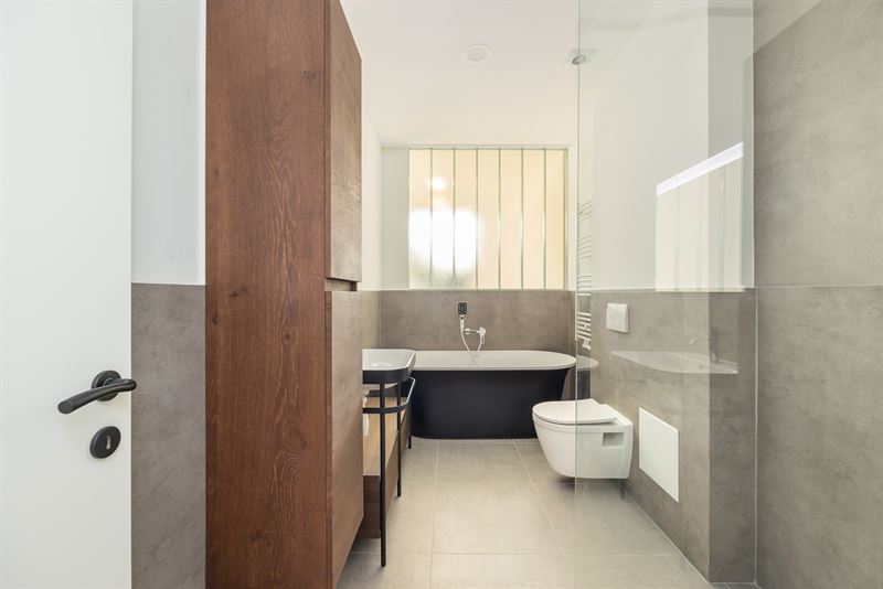douche en een derde toilet. Alles afgewerkt met dezelfde warme parketvloer en veel licht.