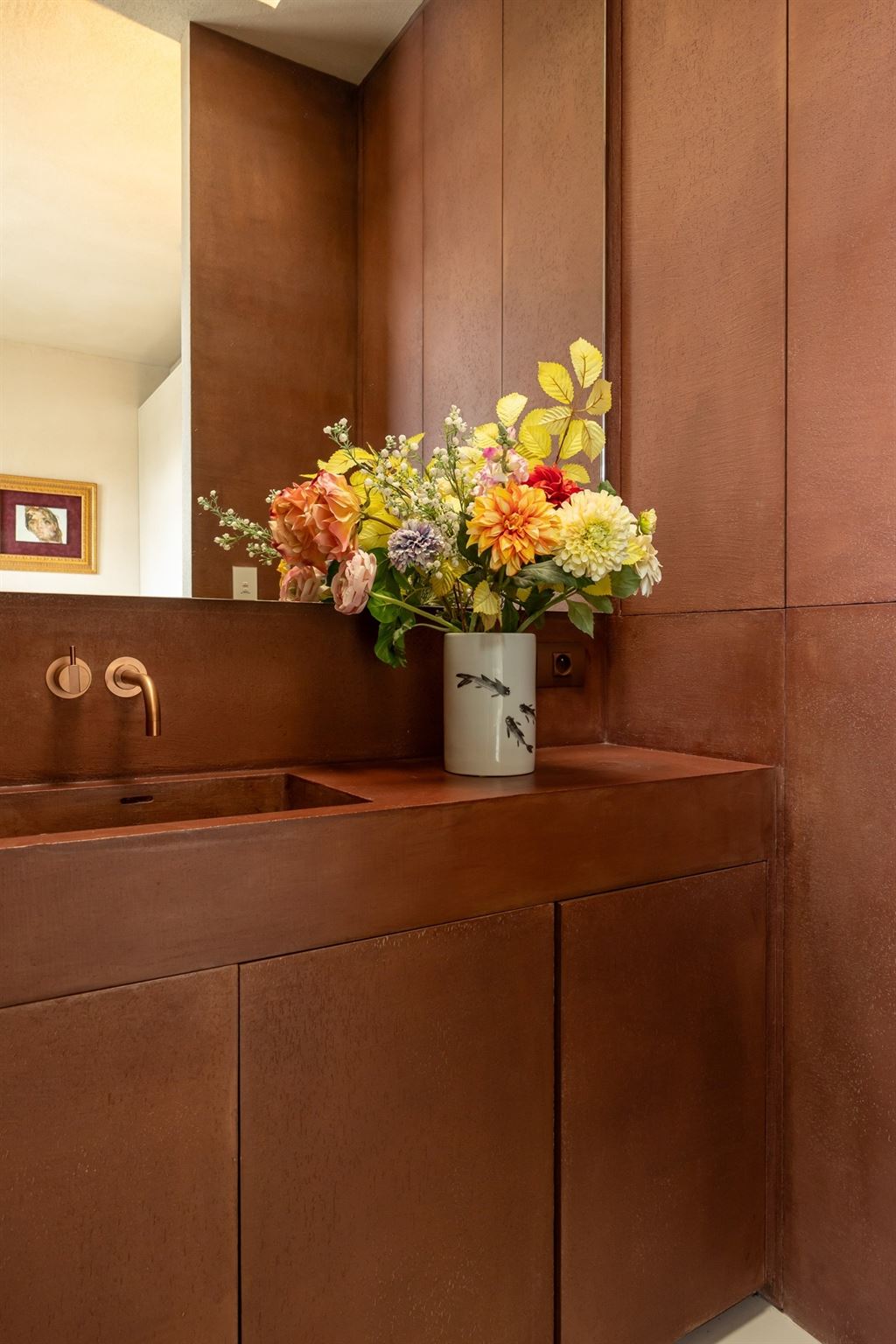 gastentoilet leidt je naar een lichte leefruimte met gashaard en epoxyvloer. Grote harmonicadeuren