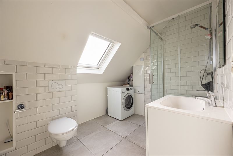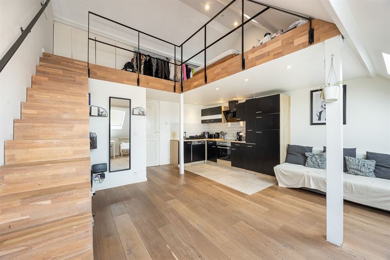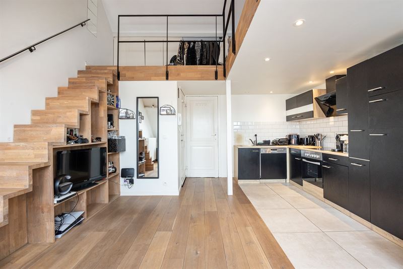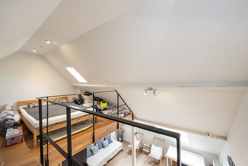 Je betreedt het penthouse via de modern afgewerkte veiligheidsdeur. De inkomhal met vestiaire en gastentoilet leidt je naar een lichte leefruimte met gashaard en epoxyvloer. Grote harmonicadeuren verbinden de leefruimte met het enorme terras achter en vooraan. De open keuken is uitgerust met onder andere een wijnklimaatkast, stoomoven, inductiekookplaat en extra koelkast, afgewerkt met notelaarhouten kasten en een strak werkblad.