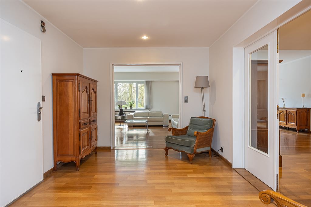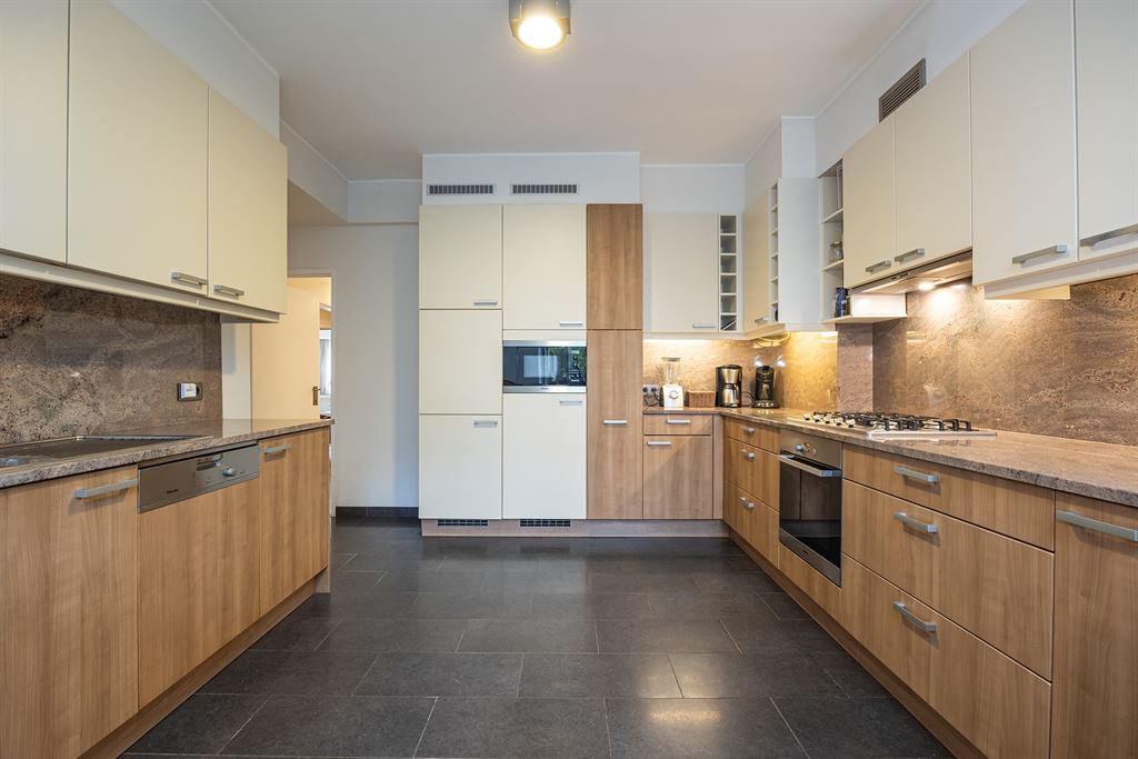 Je komt binnen via een ruime inkomhal met veiligheidsdeur. De dubbele glazen deur leidt je naar de indrukwekkende leefruimte, waar het daglicht rijkelijk binnenvalt langs de brede raampartijen. Met z’n ca 75 m², warme parketvloer en hoge plafonds voelt deze ruimte tegelijk groots en gezellig aan. Hier richt je moeiteloos een royale zithoek én een grote eettafel in, telkens met zicht op het groen van het Stadspark. De keuken is apart en bijzonder ruim, met een natuurstenen werkblad en overvloed aan kastruimte. Ze is volledig uitgerust met gasfornuis, oven, microgolf, dubbele spoelbak, vaatwasser en koelkast met diepvries. Aansluitend vind je een praktische wasruimte én toegang tot het terras.