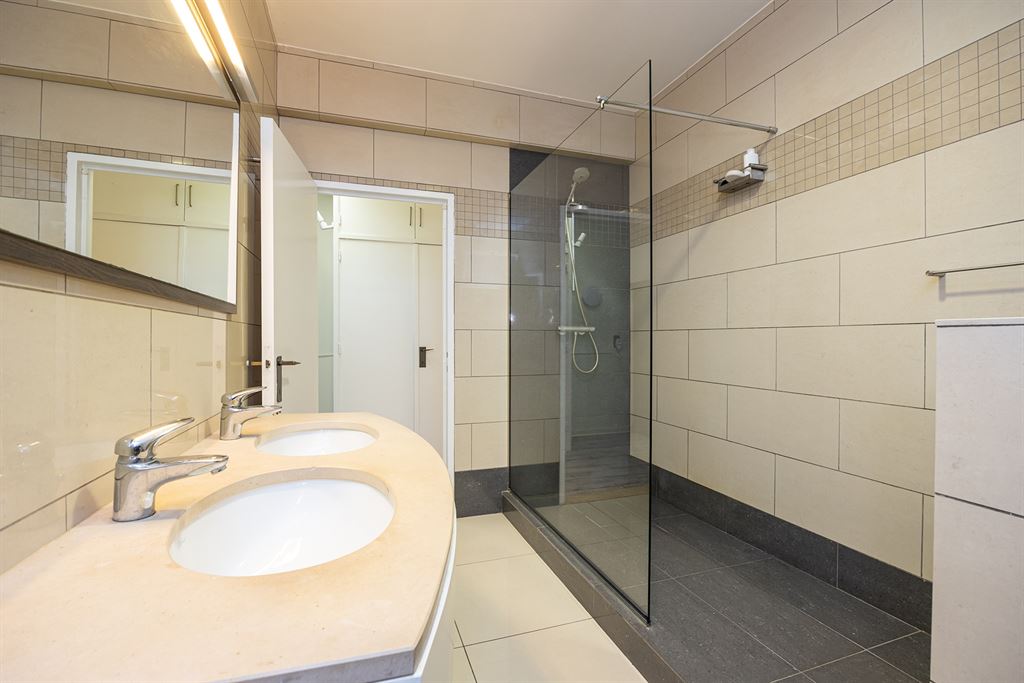 De badkamer is royaal en volledig ingericht met een grote inloopdouche, dubbele lavabo in natuursteen, extra toilet en maatkasten. Alles is netjes afgewerkt en praktisch ingedeeld.