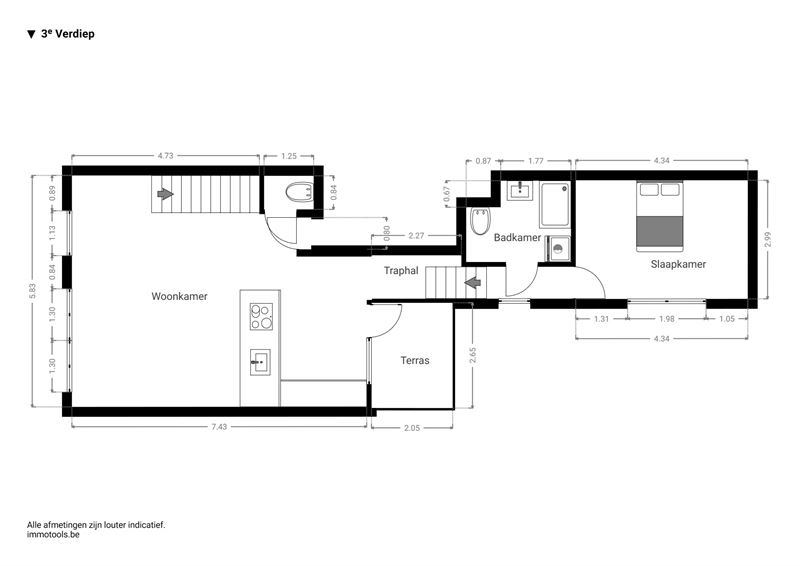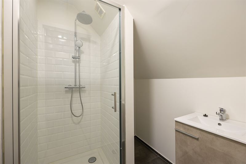 zorgt er op elegante wijze voor dat alles zijn plek vindt. Links ontdek je de badkamer — een ruimte