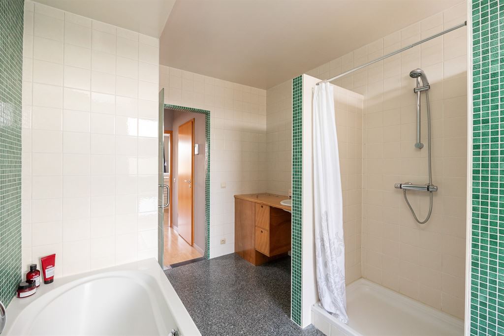 straatzijde. De badkamer is afgewerkt met een fijne groene mozaïek tegel en voorzien van ligbad,