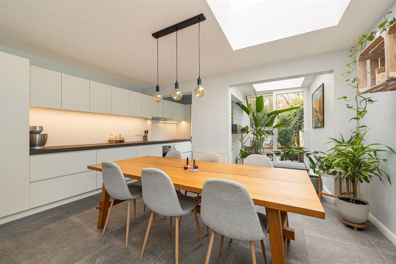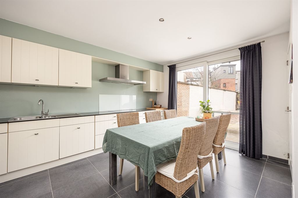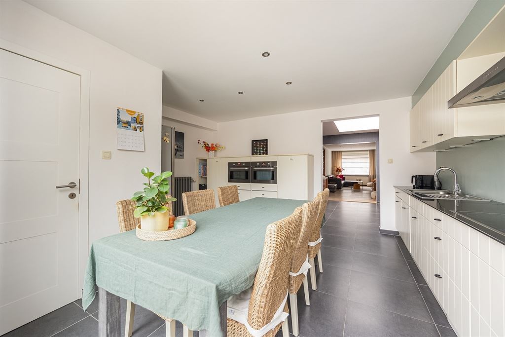 Vooraan op het gelijkvloers bevindt zich het salon, afgewerkt met ingebouwde spots en een mooie parketvloer die meteen voor een warme uitstraling zorgt. Aansluitend ligt de eetkamer, met daarachter de volledig uitgeruste keuken. Dankzij de doorlopende tegelvloer vloeien eetkamer en keuken naadloos in elkaar over. De keuken is opvallend ruim, met plaats voor een extra eettafel en stoelen — aan ruimte om gezellig te tafelen geen gebrek. Ze is uitgerust met een ingebouwde oven en microgolfoven, vaatwasser, dubbele spoelbak, keramische kookplaat, dampkap en een stijlvol granieten werkblad. De grote koelkast blijft bovendien aanwezig. Via het schuifraam in de keuken stap je zo de verzorgde tuin in, waar een zonneluifel voor aangename schaduw zorgt tijdens lange, gezellige etentjes buiten. Achteraan de tuin vind je bovendien een praktisch tuinhuis, ideaal voor extra berging van tuinmateriaal of fietsen.