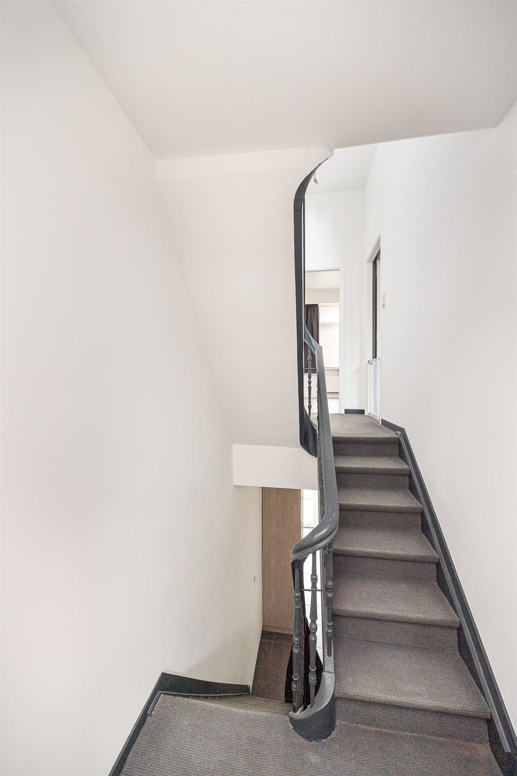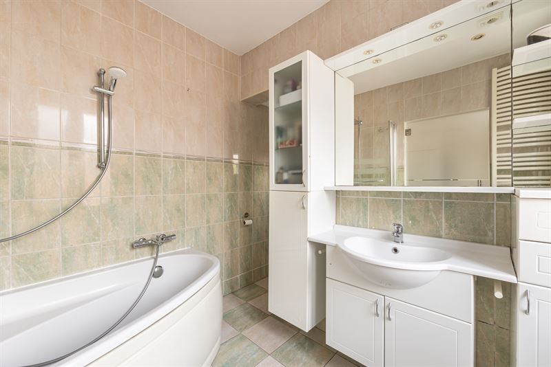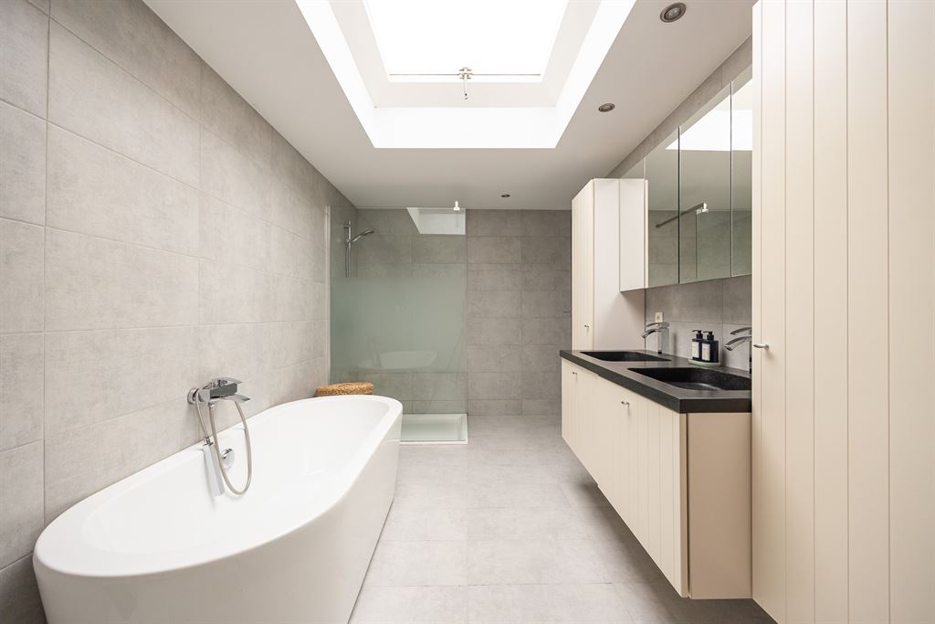 Op de eerste tussenverdieping bevindt zich de badkamer, met vlak ervoor een aparte wasruimte — altijd praktisch. De badkamer is volledig uitgerust en biedt comfortabel veel plaats. Je vindt er een ligbad, een inloopdouche, een toilet en een badmeubel met dubbele lavabo en voldoende kastruimte. Zowel de muren als de vloer zijn afgewerkt met dezelfde stijlvolle grijze tegel, wat zorgt voor een mooi en rustgevend geheel.