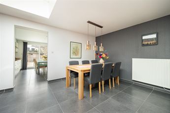 Parkeerstress is hier verleden tijd, want optioneel is er de mogelijkheid om een garagebox bij te huren. — een echte luxe op deze locatie net buiten de stad. De inkomhal met stijlvolle grijze tegel is voorzien van een praktische ingemaakte kast en vormt een aangename binnenkomer. Van hieruit wandel je door naar de eetkamer, met aansluitend de keuken en zicht op de tuin. Onder de trap bevindt zich bovendien de deur naar de kelder, handig als extra bergruimte.