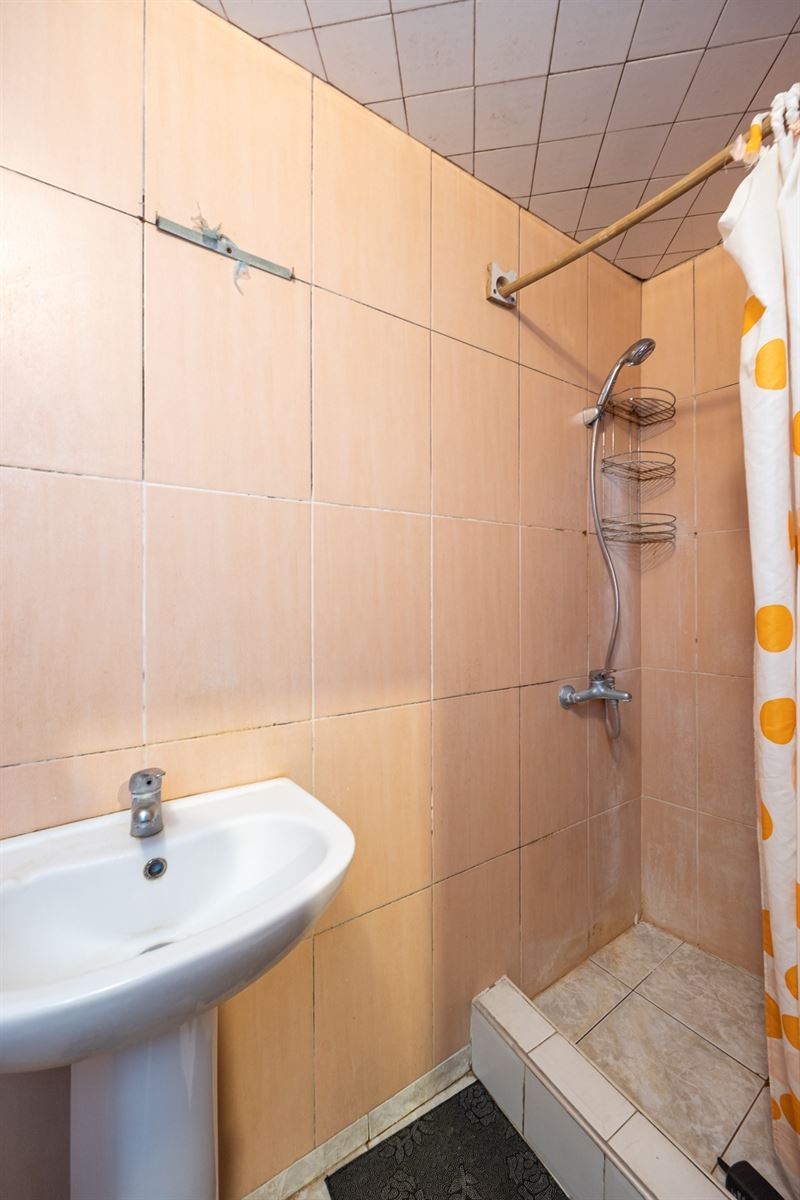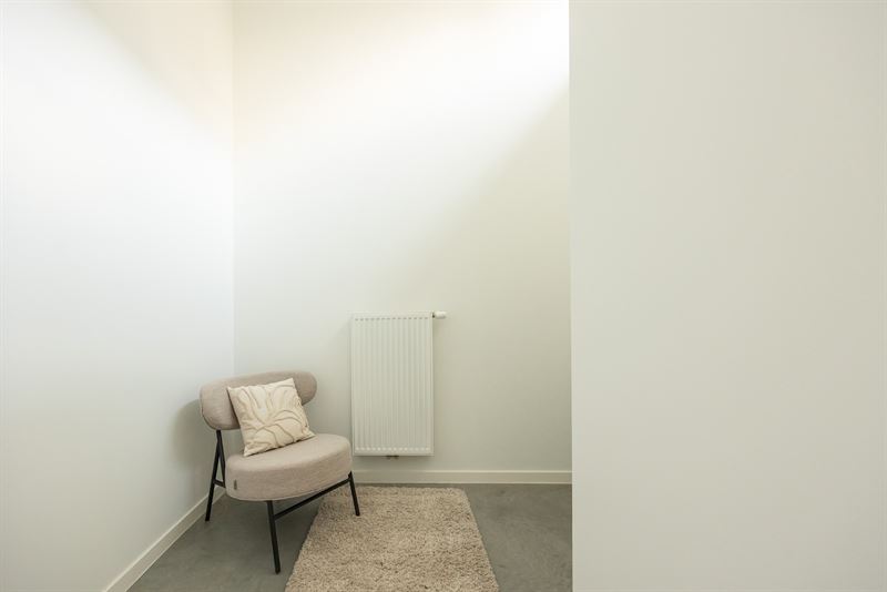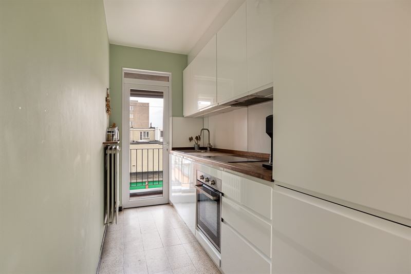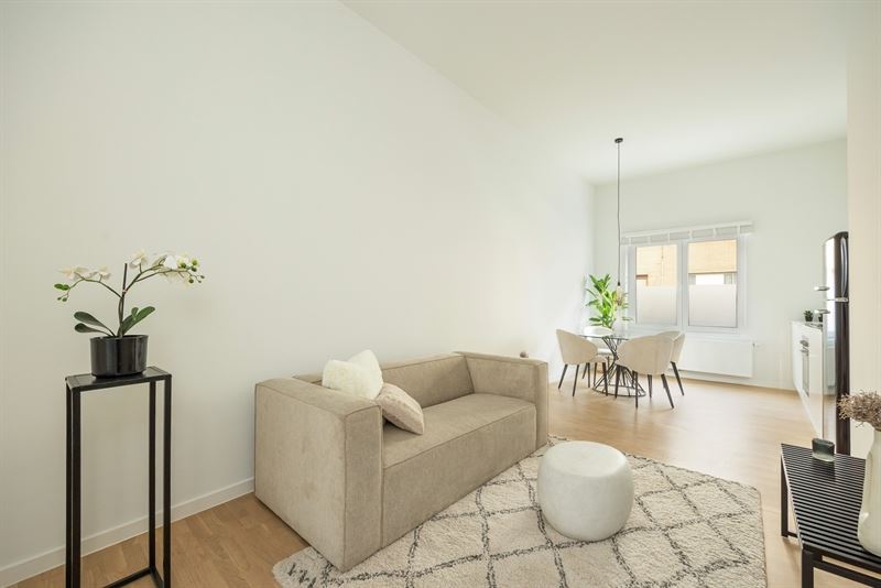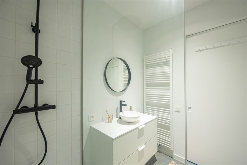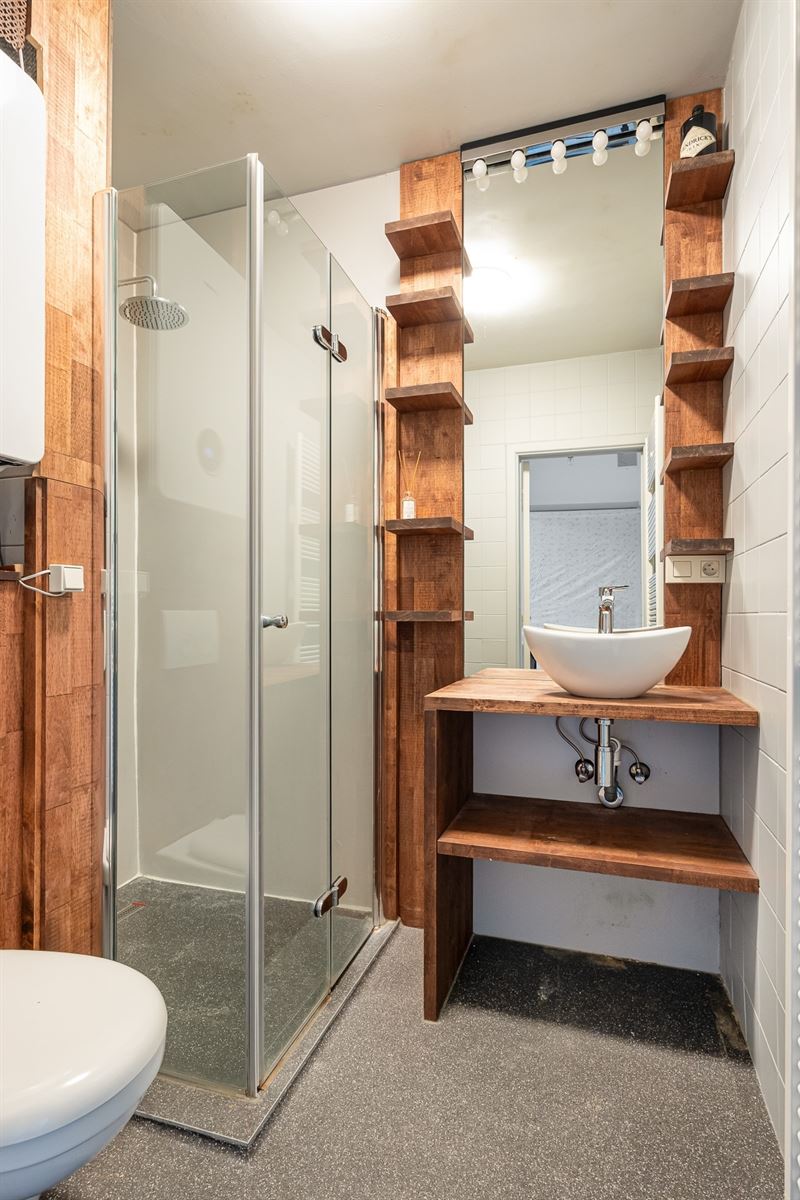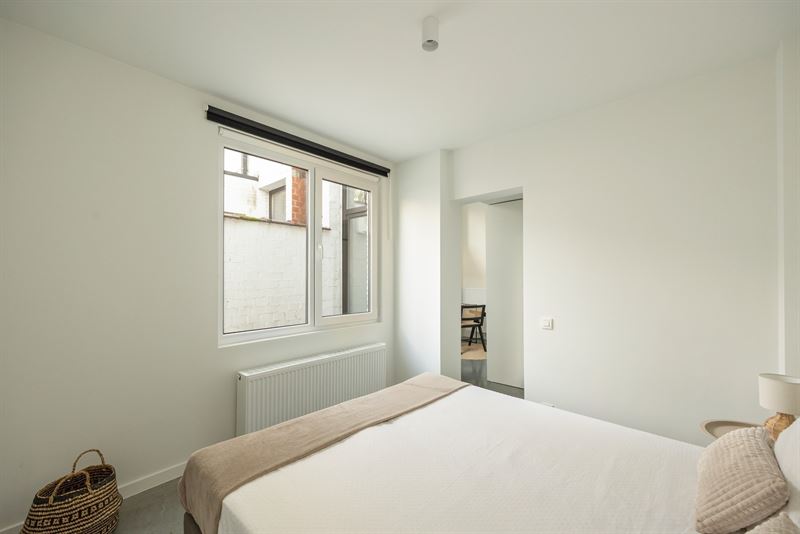 Via de gemeenschappelijke inkomhal bereik je het appartement met zijn aangename visgraatvloer en lichtrijke leefruimte. Hier maak je makkelijk een gezellige zithoek of eethoek, met voldoende plaats voor een zetel, tv-meubel en tafel. De moderne keuken met veranda vormt het hart van de woning. Ze is volledig uitgerust met oven, afwasmachine, kookplaat, dampkap, inbouwkoelkast en vriezer. De veranda in aluminium met lichtkoepel zorgt voor een overvloed aan natuurlijk licht en geeft directe toegang tot de tuin. Het zicht op het groen maakt dit een heerlijke plek om te koken, werken of ontspannen. De slaapkamer (14 m²) ligt rustig aan de achterzijde van het gebouw en biedt plaats aan een dubbel bed en kastenwand. De badkamer is betegeld, voorzien van badkuip, badkamermeubel met spiegelkast, en aansluitingen voor wasmachine en droogkast. Daarnaast is er nog een apart toilet met handenwasser.