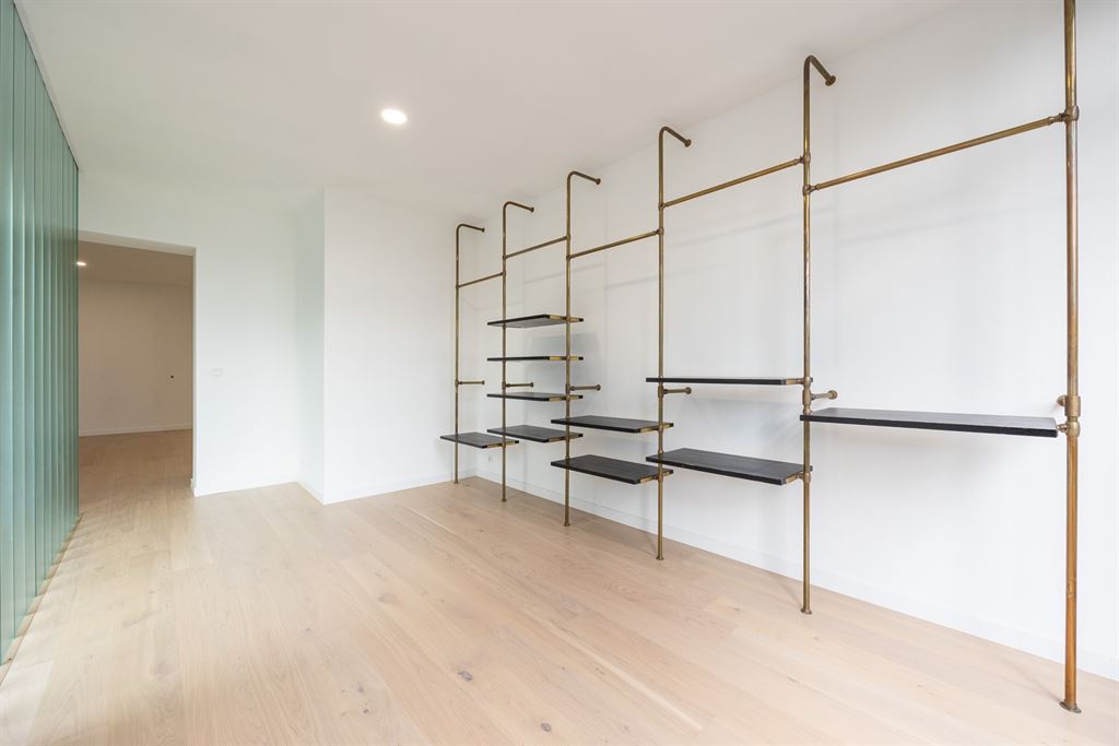douche en een derde toilet. Alles afgewerkt met dezelfde warme parketvloer en veel licht.