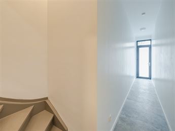 centrale, open hal, waar alle ruimtes op uitkomen. De mooie, lichte parketvloer die je hier ziet, loopt