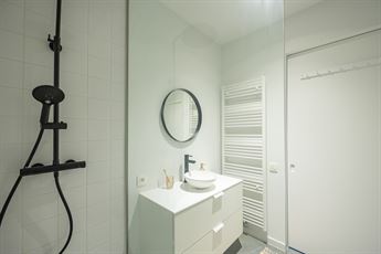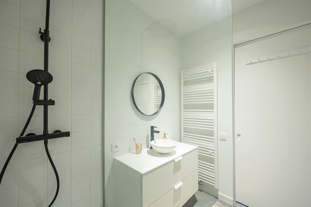 lavabomeubel met twee lades, handdoekdroger en ventilatiesysteem. Alles werd smaakvol en