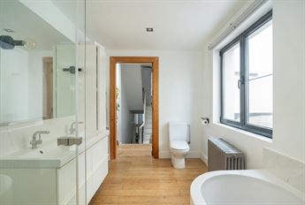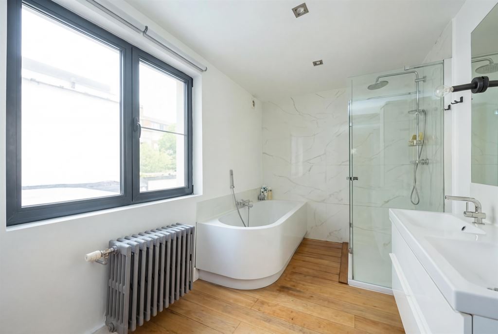 regendouche, aparte badkuip, dubbele lavabo met meubel, toilet, ventilatiesysteem én parketvloer