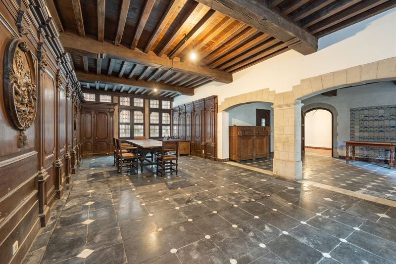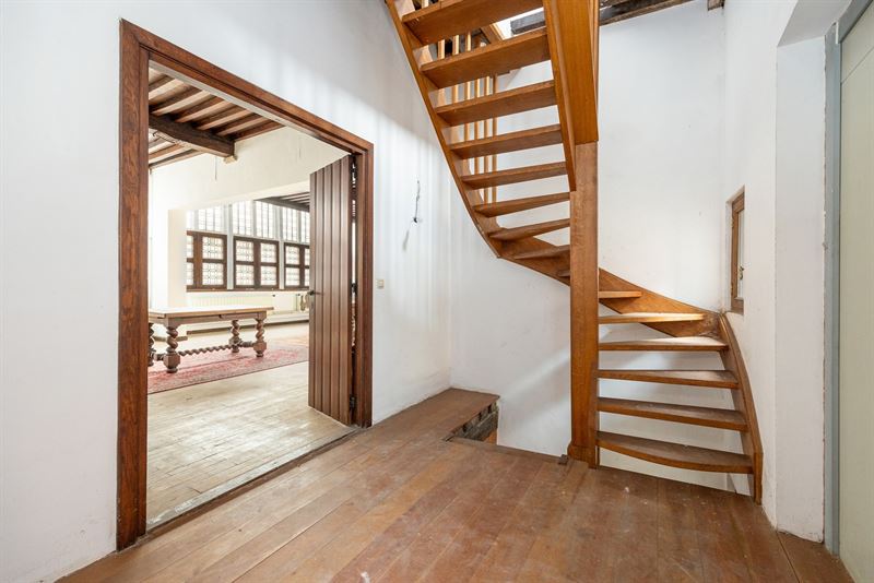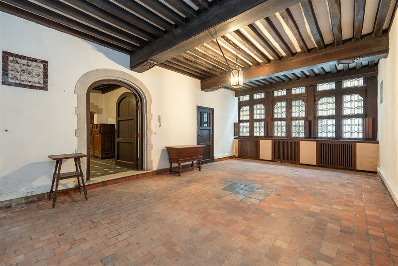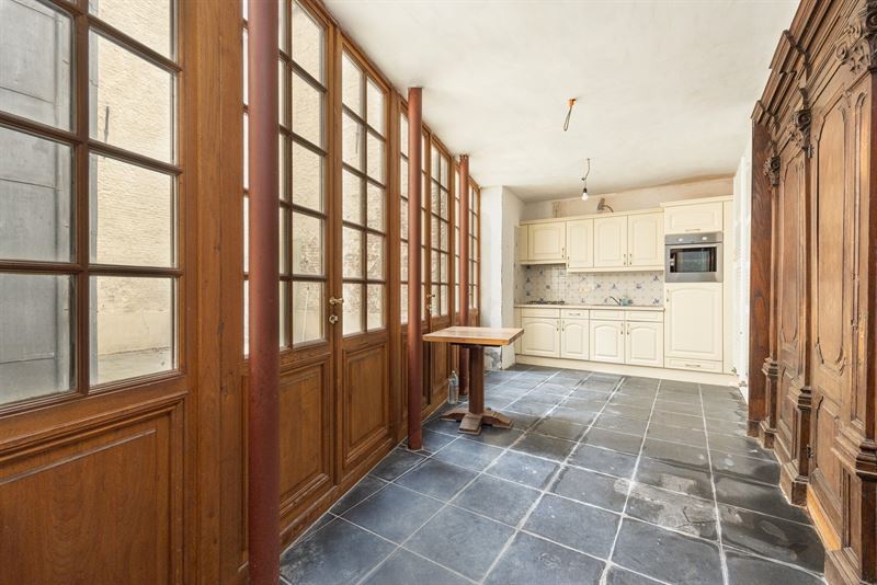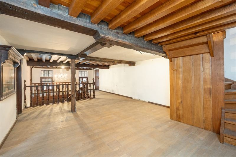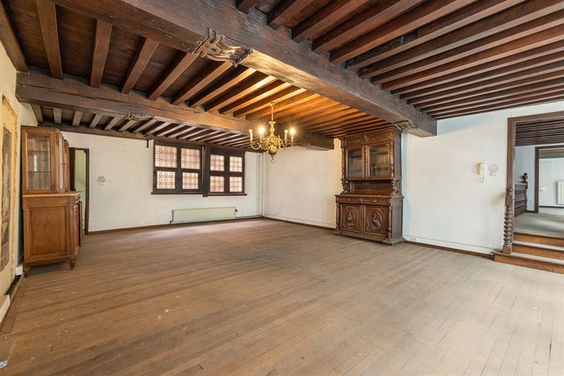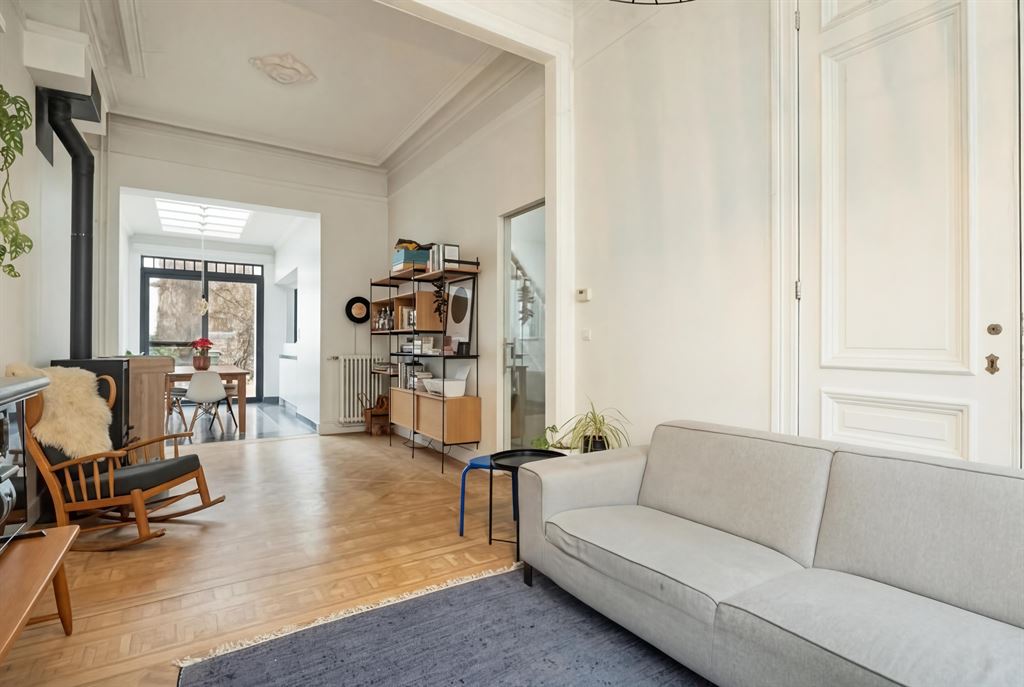 ruimte met authentieke sierlijsten, hoge plafonds en een stijlvolle parketvloer. Achteraan zorgt een