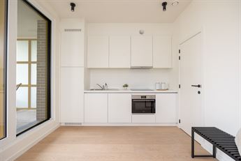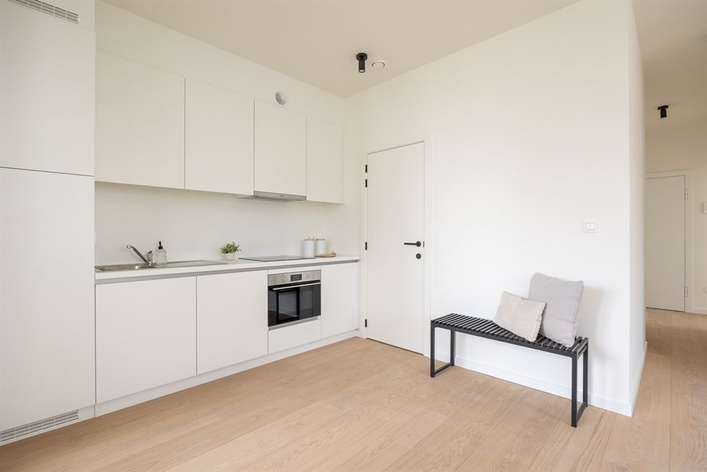 De open keuken is uitgerust met toestellen van Whirlpool (opnieuw een garantie op topkwaliteit), een inductieplaat en een mooi werkblad. De keuken vormt één geheel met de indrukwekkend lichtrijke leefruimte. Door de grote ramen valt er de hele dag door veel licht binnen. Deze ruimte is het kloppend hart van het appartement: ideaal om tot rust te komen of gasten te ontvangen.