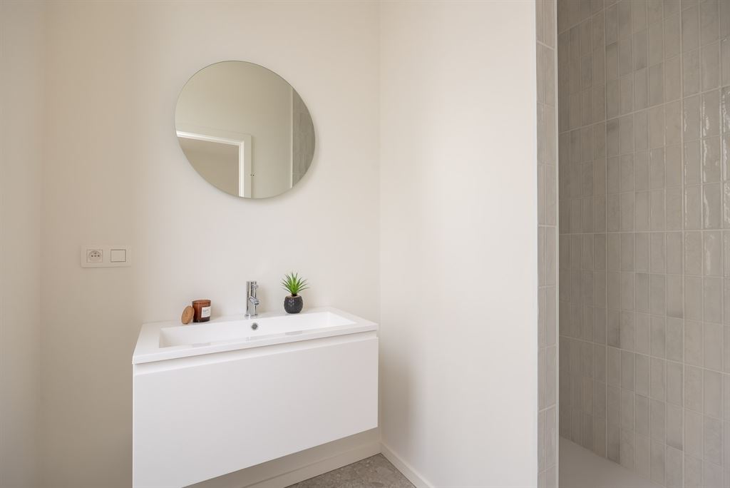 De ruime slaapkamer heeft dezelfde parketvloer als de leefruimte, Alu-ramen en ingebouwde verluchting. De ensuite badkamer is luxueus afgewerkt met een inloopdouche met regenkraan en keramische tegels, dubbele lavabo, een ronde spiegel en terrazzotegels in steenlook.