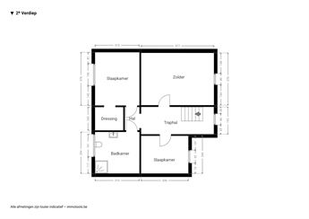 Op de tweede verdieping vind je een volwaardige slaapverdieping met drie kamers, een dressing en een badkamer. De grootste kamer – 20 m² – doet dankzij het open dakvolume denken aan een kleine loft en kan perfect dienstdoen als master bedroom, studio of hobbyruimte. Daarnaast is er nog een slaapkamer met een handige ensuite dressing, en een derde slaapkamer met witgeschilderde plankenvloer die meteen gezellig aanvoelt. De badkamer is praktisch ingericht met een douche, toilet en ruim lavabomeubel en vormt een centrale, handige ruimte op deze verdieping.