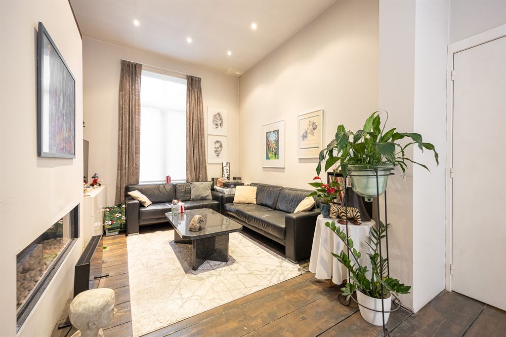 Via de brede traphal kom je op de eerste verdieping in een verrassend lichte en aangename leefruimte, waar de authentieke plankenvloer en hoge plafonds meteen zorgen voor een warme sfeer. De grote ramen langs beide kanten laten veel natuurlijk licht binnen, waardoor dit een heerlijke plek is om te ontspannen of te ontvangen. Rechts van de leefruimte bevindt zich de open keuken, volledig geïnstalleerd en uitgerust met o.a. een oven, koelkast, diepvries, gasvuur, dampkap en anderhalve spoelbak. Dankzij het compacte ontbijthoekje heb je hier een gezellige plek voor je eerste koffie van de dag. Links van de leefruimte ligt een slaapkamer die zeker kan dienen als kinderkamer, logeerkamer of thuiskantoor.