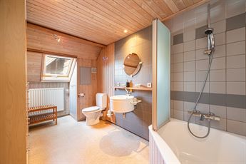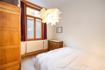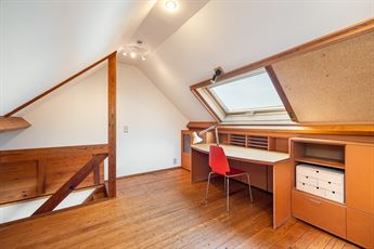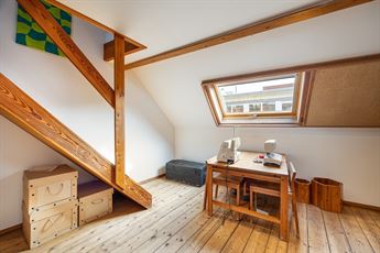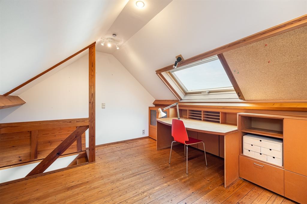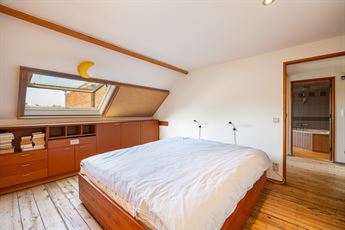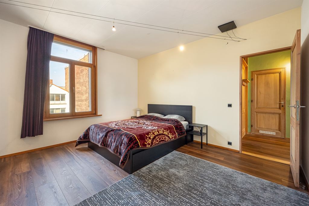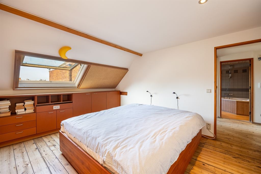 De tweede verdieping telt een gigantische slaapkamer van ca. 38,5 m² (momenteel met kastenwand), perfect als master of opdeelbaar naar wens. Daarnaast vind je een tweede ruime slaapkamer met zicht op het dakterras en een badkamer met ingemaakt ligbad, dubbele lavabo, aparte douchecabine en toilet. Houten afwerkingen en parket zorgen voor een warme uitstraling.