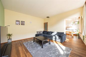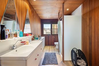 Op de eerste verdieping ontvouwt zich het hart van de woning: een open keuken met leefruimte van maar liefst ca.59 m². De keuken is hoogwaardig afgewerkt met een massief stenen werkblad, inductievuur, oven, microgolf, vaatwasser, glazen spatwand en overvloedige kastruimte. Alles sluit naadloos aan bij het maatwerk en de warme houtaccenten die doorheen de woning zijn doorgetrokken (renovatie van deze verdieping in 2021). Aansluitend bevindt zich de zitruimte met kachel — open verbonden, maar toch gezellig afgescheiden.
