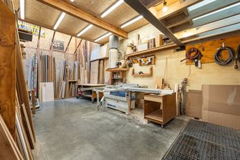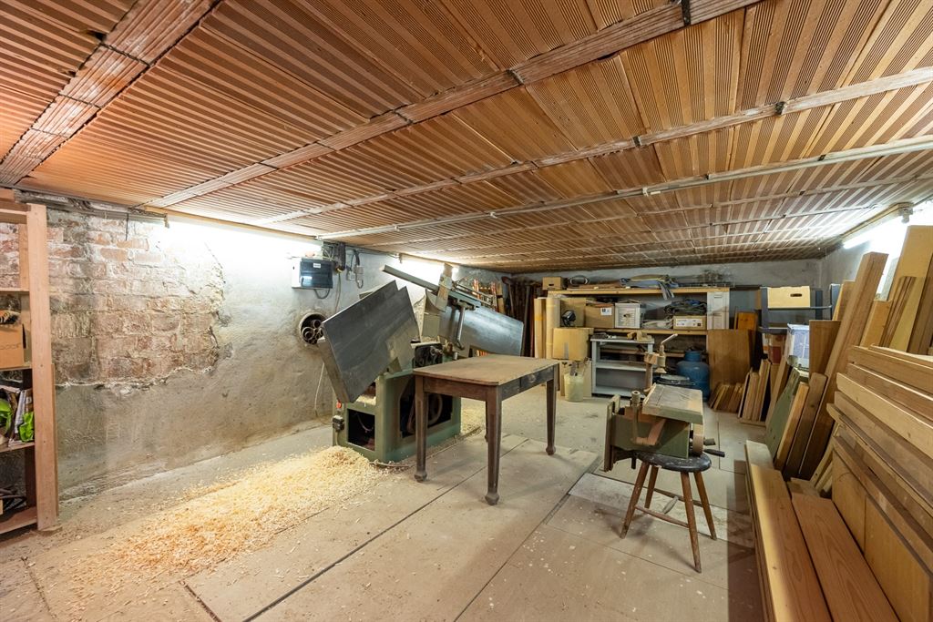 Het atelier (ca.65 m²) met een plafondhoogte van 3,5 meter en dakramen is een droom voor doe-het-zelvers, zelfstandigen of hobbyisten. Momenteel ingericht als schrijnwerkerij, maar perfect inzetbaar als werkplaats, studio of opslagruimte. Extra troef: atelier is eveneens onderkelderd.