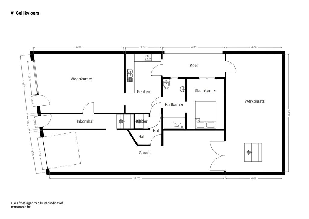 De inpandige garage heeft een indrukwekkende poorthoogte van 3,3 meter en een breedte van 3 meter — perfect voor wagen én fietsen. Via de garage bereik je de ruime, droge kelder én het achterliggende atelier.