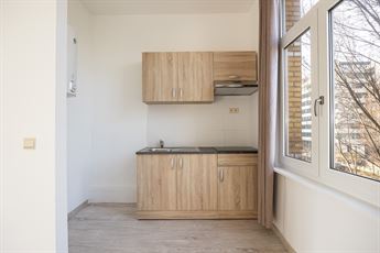 Je bereikt de studio op de tweede verdieping van een kleinschalig gebouw. Via de inkomhal stap je meteen de leefruimte binnen, die met zo’n 23,5 m² verrassend ruim aanvoelt. De grote raampartijen trekken veel natuurlijk licht naar binnen en geven je een open zicht op de woonwijk. De lichte parketlaminaatvloer zorgt voor een warme, neutrale basis die je makkelijk naar je eigen smaak inricht.