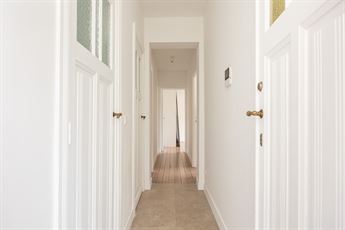Via de privé-inkom op het gelijkvloers (ca. 11 m²) met witte vloertegels en een charmante, geschilderde trap, kom je boven in de ruime hal met hoge plafonds en originele planchetten vloer. De woonkamer met planchetten vloer, hoge ramen en Frans balkon straalt licht en warmte uit. De open keuken aansluitend met licht houten kasten, wit werkblad, inductieplaat, ingebouwde oven en vaatwasser – ideaal om gezellig te koken en te tafelen.